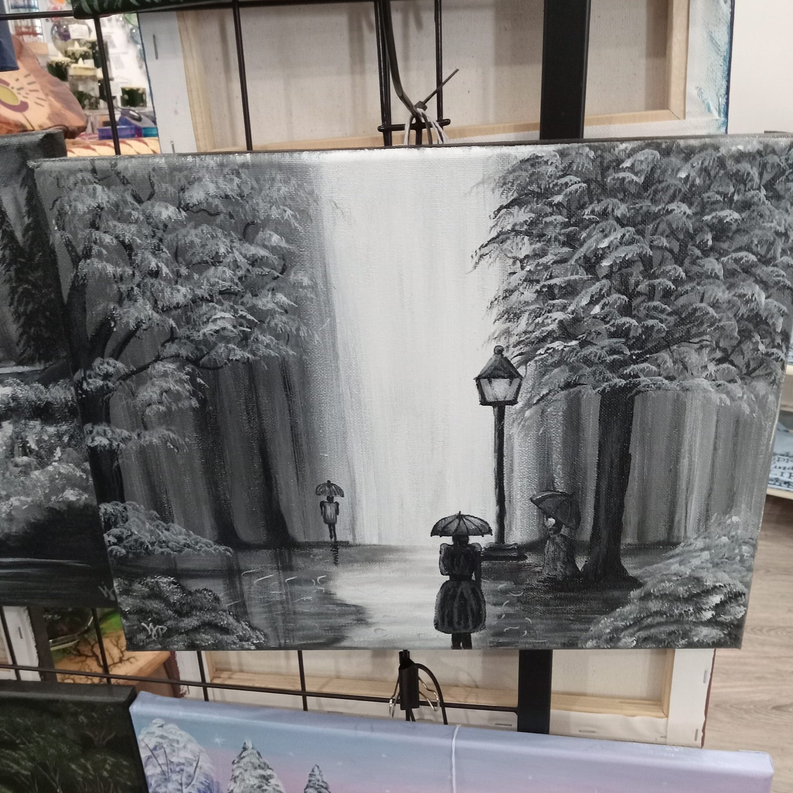 A dramatic black-and-white painting capturing the quiet beauty of someone walking in the rain. Perfect for modern, minimalist, or urban-inspired décor, adding a touch of elegance and mood to any space