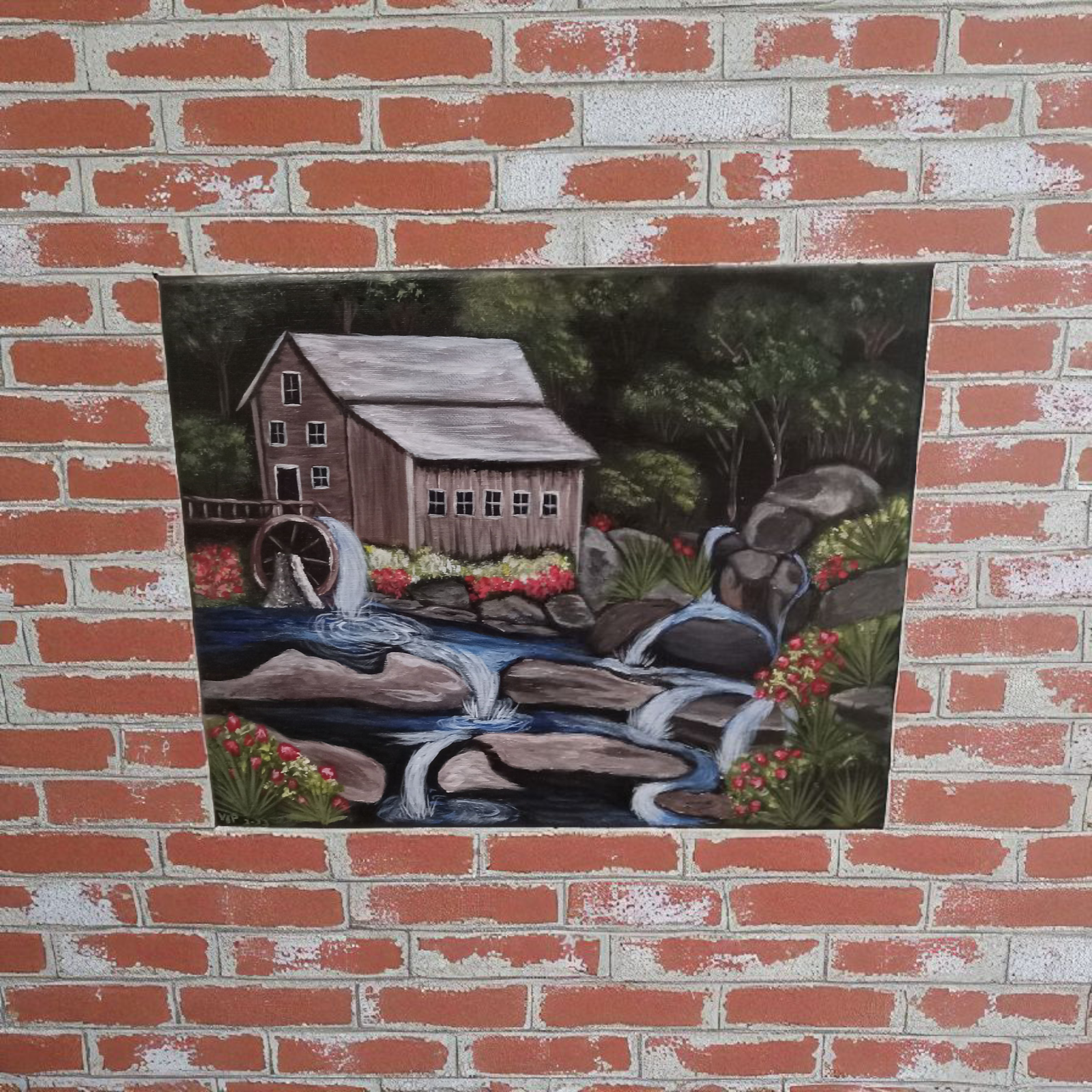 A charming painting of a rustic barn beside a working watermill, capturing the serene beauty of the countryside. Perfect for farmhouse, rustic, or nature-inspired décor, adding warmth and pastoral charm to any space.
