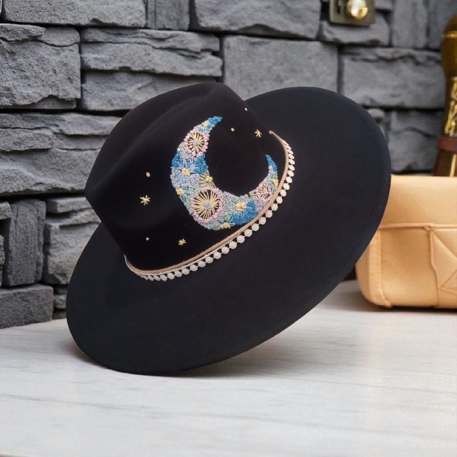 Embrace the night with this striking black brimmed hat from Forge & Fusion. Adorned with an intricately detailed moon design, it channels mystery, magic, and celestial vibes. Whether you’re stargazing or stepping out in style, this artisan-crafted hat is made to stand out and inspire.